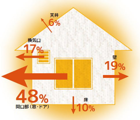 一般的に室内で温めた熱が外に逃げる比率として、外壁から19%に対し、窓からは48%になり、せっかく温めた家の熱の約半分が窓から逃げてしまいます。