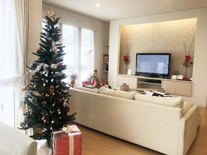 リビングに特大のクリスマスツリーとプレゼントを配置しました!