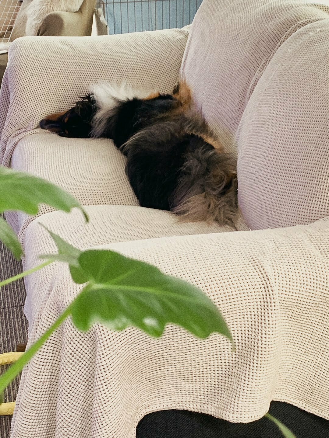 現在のエアコン設定温度は20~22℃を目安にしています。環境省が推奨している暖房の設定温度が20℃らしいので、だいたい標準くらいでしょうか。ちょっと寒いかな、と思う時は22℃にします。ワンコもみょーんと伸びて気持ちよさげに寝ているので適温なのかな。