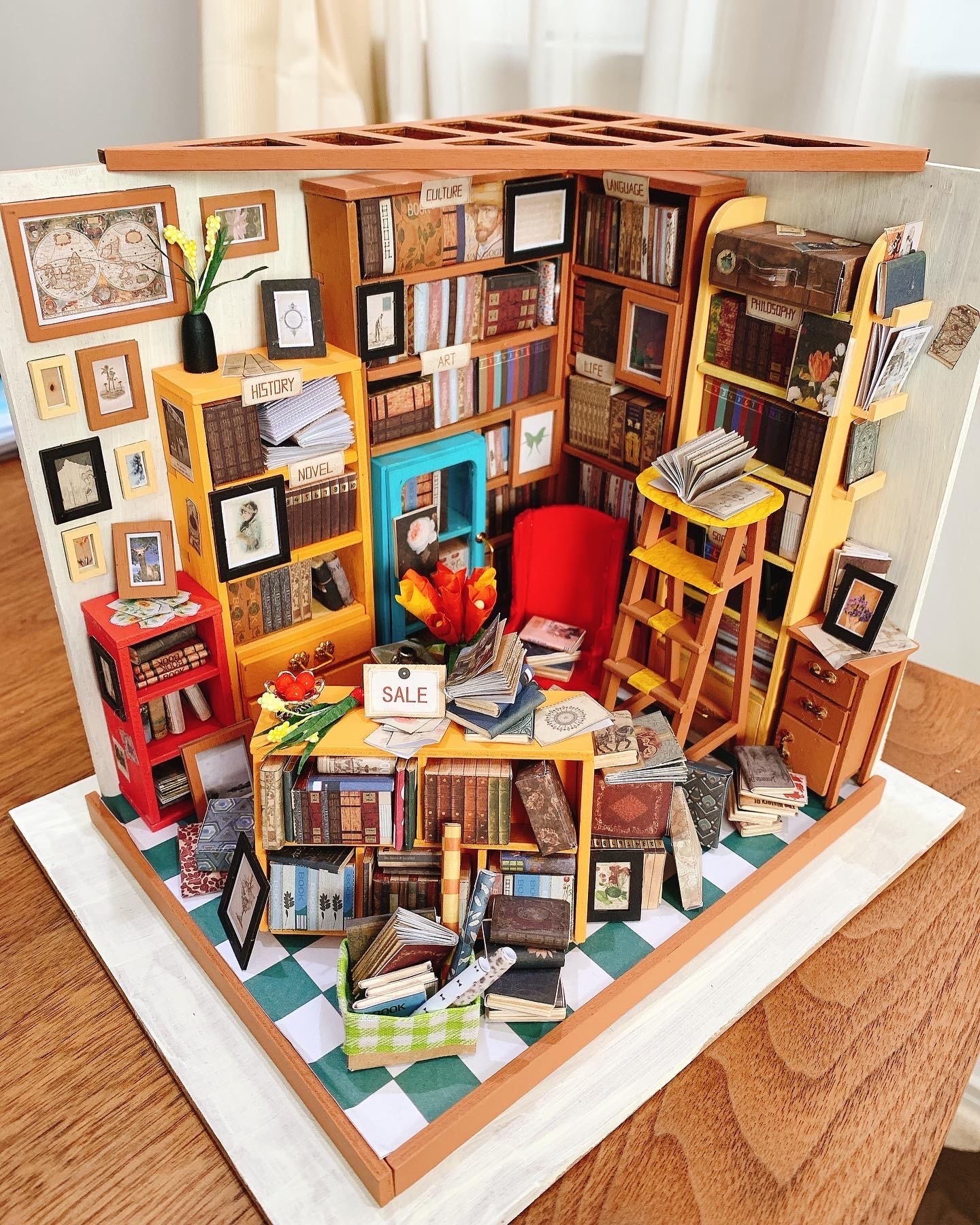 本の大きさはだいたい1.5㎝くらいかな、読書が好きなのでこんな部屋があったら素敵ーと選んだミニチュアハウス。