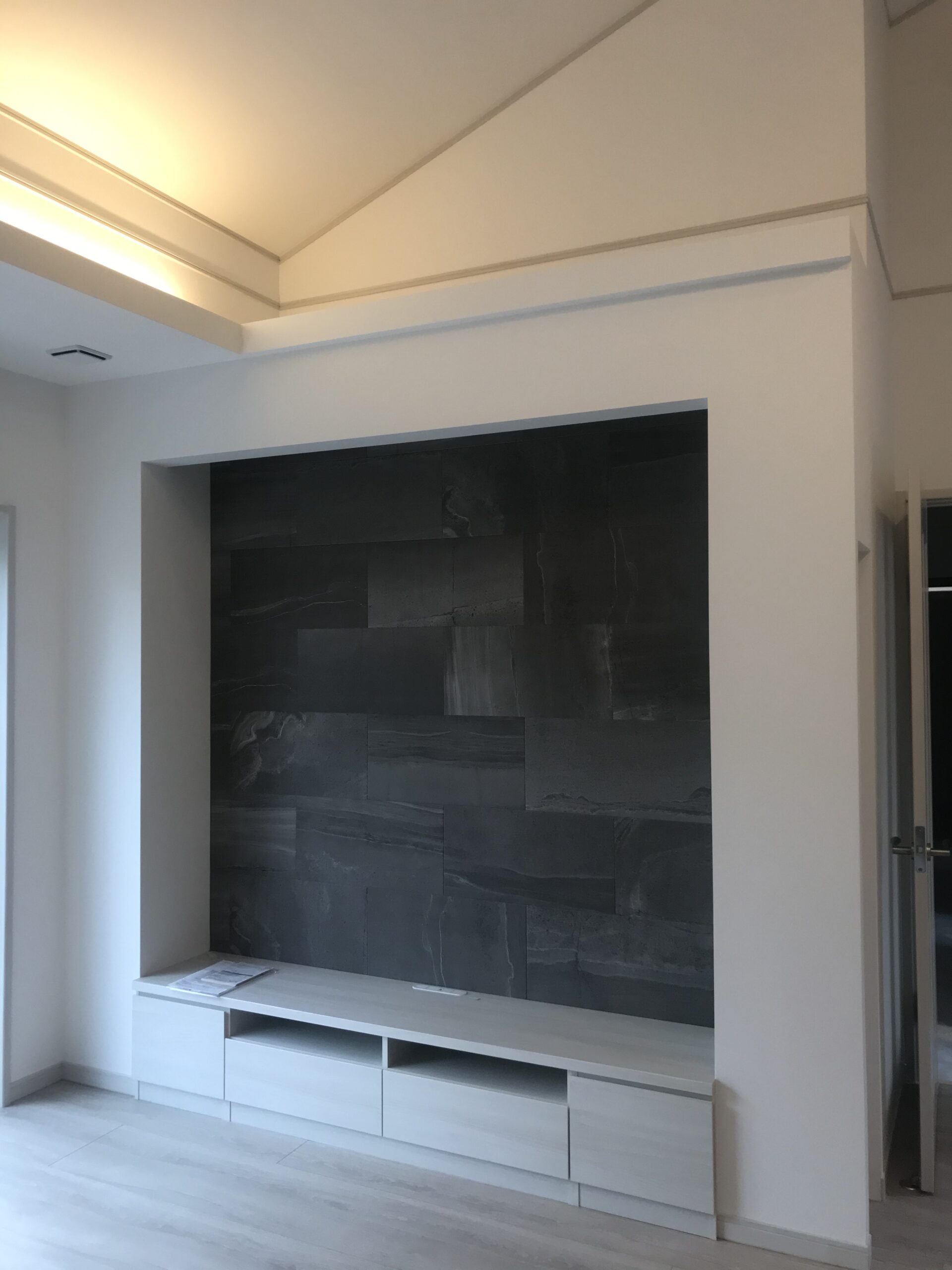 リビングのTVボード、勾配天井を照らす間接照明、この後TVボード内の