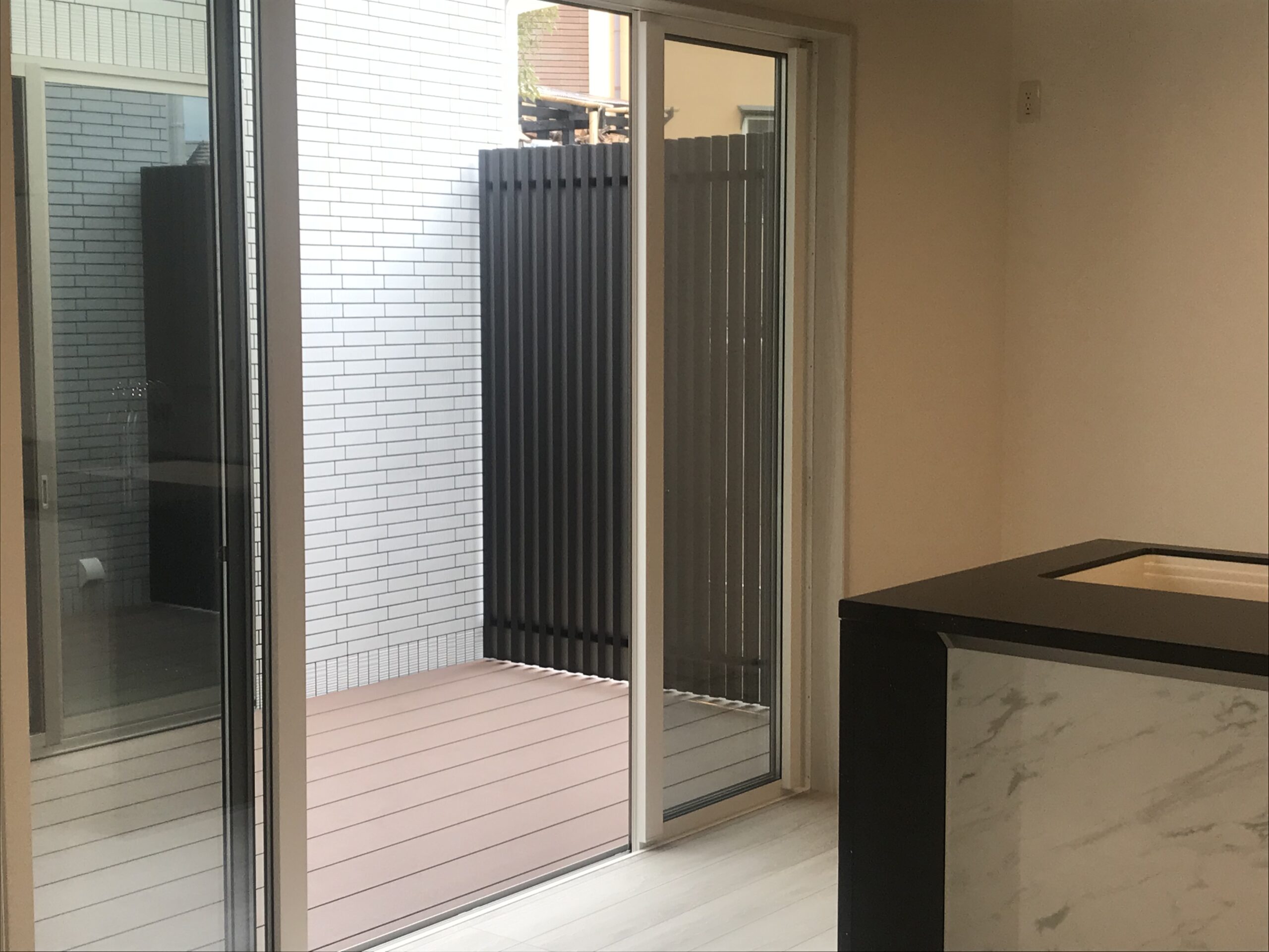 キッチンの横から続くウッドテラスの中庭、向こう側は堀こたつの和室。