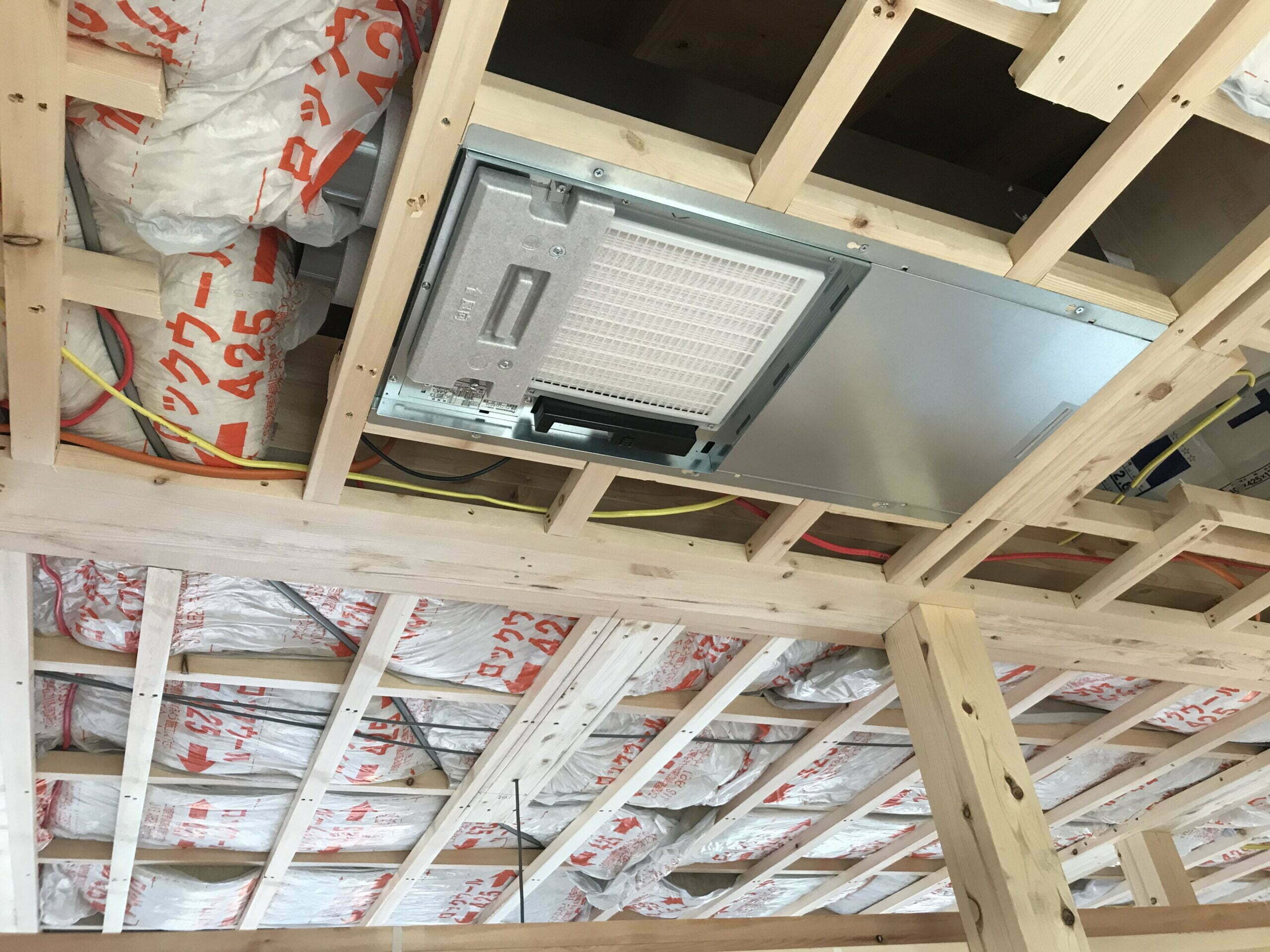 写真 奥の壁はロックウールの断熱材、標準が高気密高断熱仕様の為