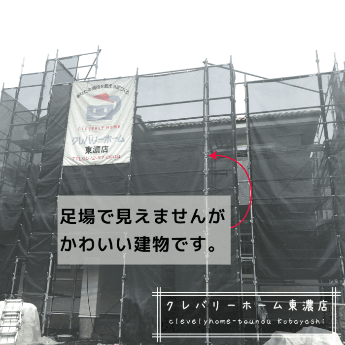 足場と養生のシートがかかっているので、外観は見えませんが、欧風デザインのかわいい建物になります。