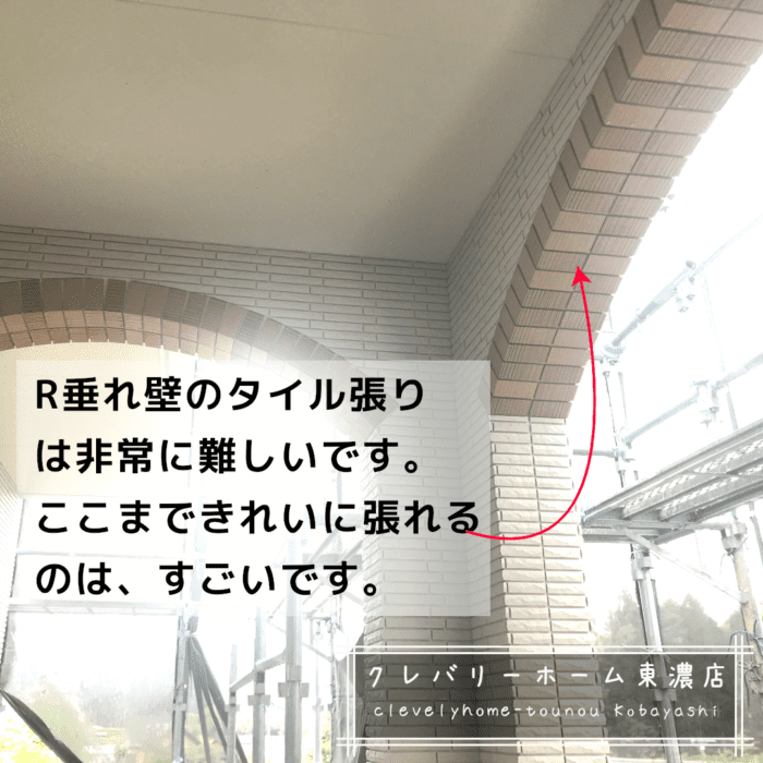玄関ポーチ部分はR(カーブ)の垂れ壁(下がり壁)になっています。タイルでカーブを張っていくのは、かなり難しいと、いつも職人から言われます。