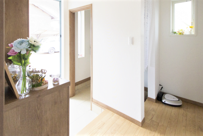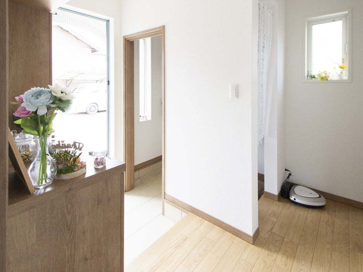 シューズクロークや造作の棚は木目調のものを使用。玄関タイルとクロスは白に統一したことで、木のぬくもりがより感じられる玄関に仕上がっています。