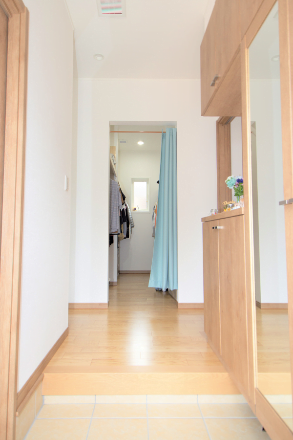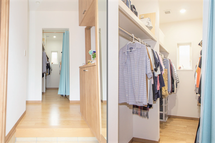 要望を受け、寝室のクローゼットとは別に、玄関にファミリークローゼットを用意しました。外出する際はこのファミリークローゼットで着替えを済ませ、そのまま出ていけるのでとても効率的です。