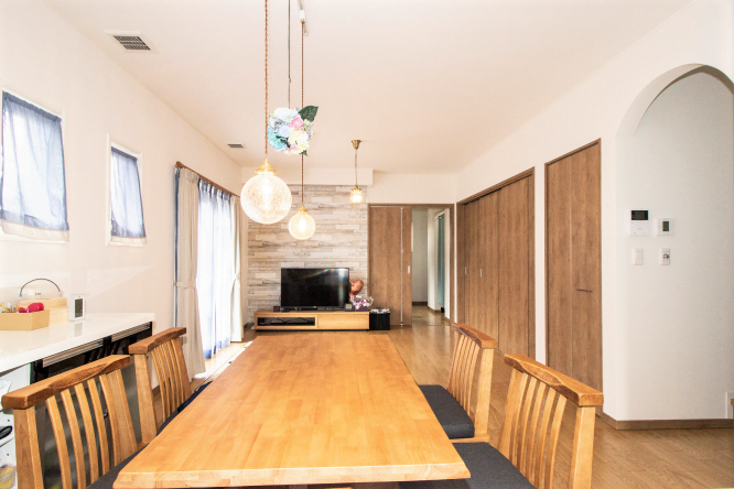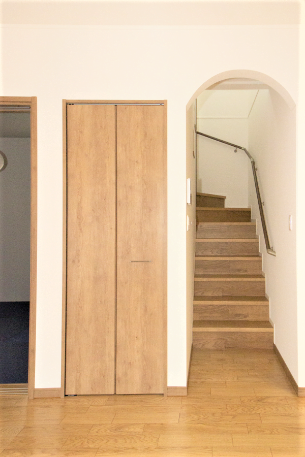 白と木を基調とし、温かみのあるLDKに仕上げています。アクセントとして、テレビ背面の壁には違う風合いの木目調のクロスを貼りました。また、階段前の上部は玄関ポーチと同じようにアーチ状に仕上げ、空間にかわいらしさをプラスしています。