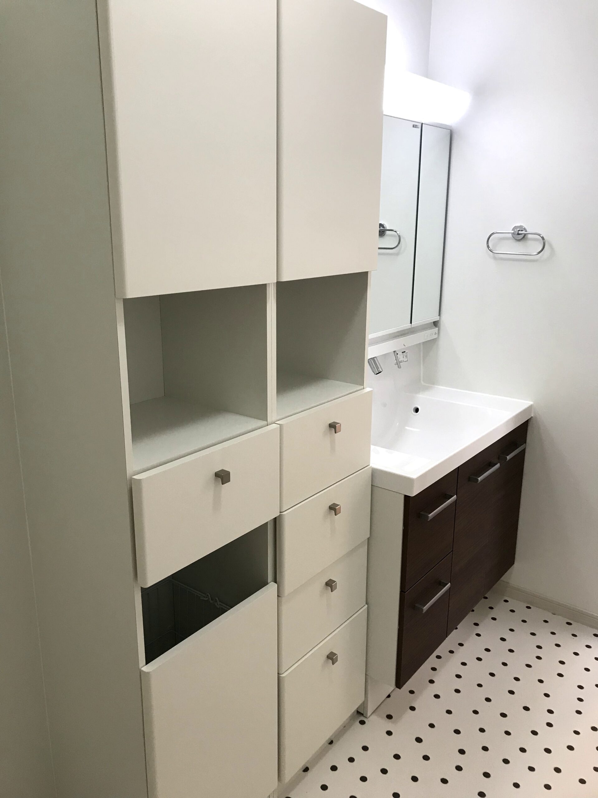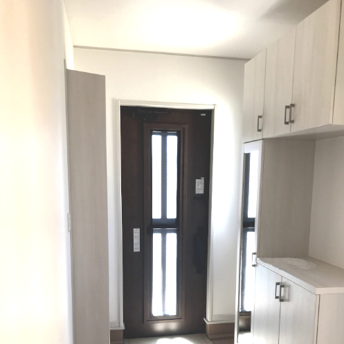 ク玄関収納は、スタイリッシュな白色 鏡も付いているので、出かけ前に身だしなみをチェックできます。