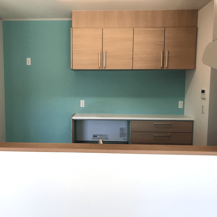 アクセントクロスと食器棚の色の組み合わせがとても合っていて、いい雰囲気を出しています。