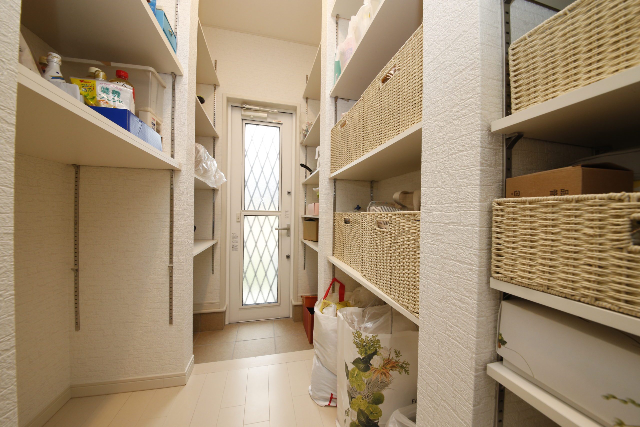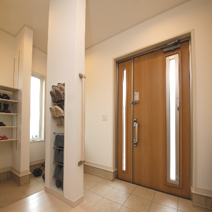 土間収納は扉を付けづにオープンにしてあります。正面からは見えない位置にクレバリーホームオリジナルスリッパ収納を装備。
