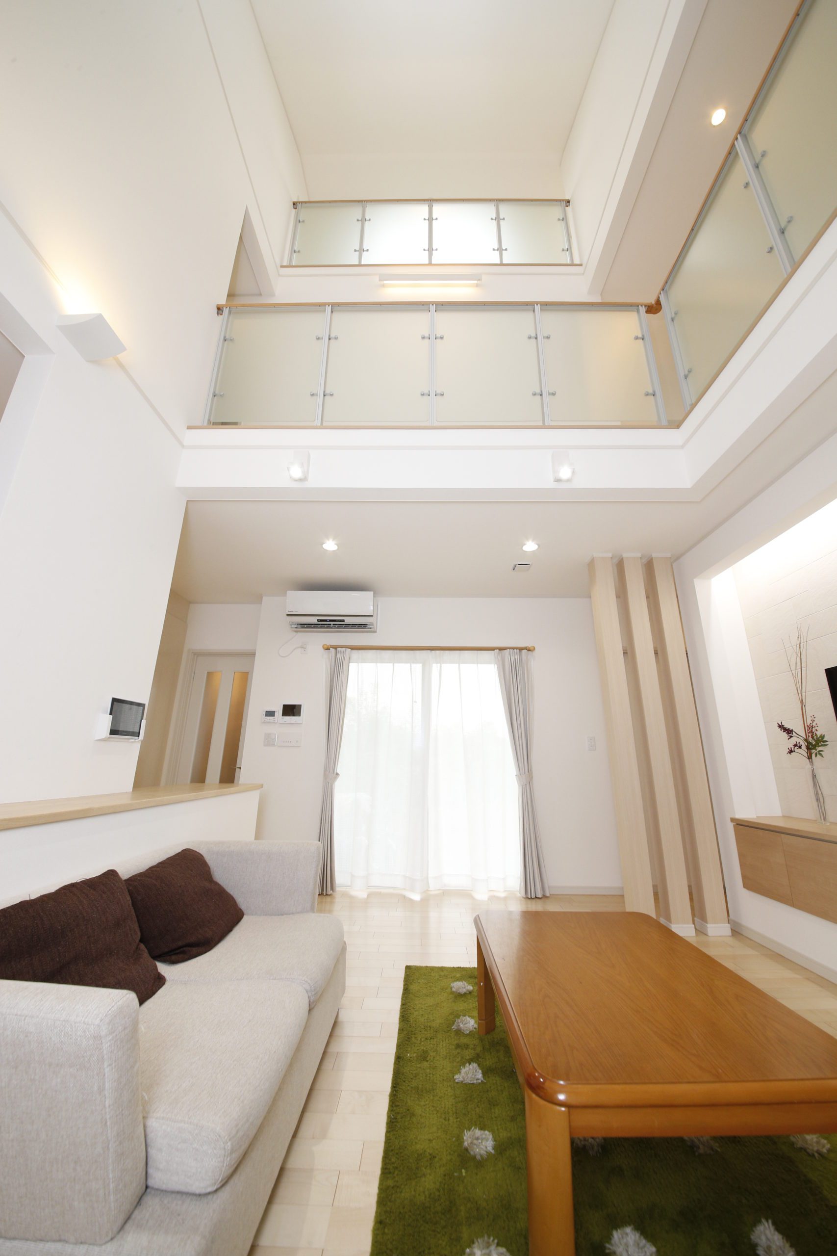 吹き抜けのあるリビングは解放感があります。照明や吹き抜け部のパネル手摺にもデザインを意識して設計してあります。