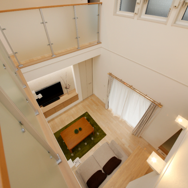 2階から吹き抜けを通して1階リビングがつながっている為、家全体の解放感と2階と1階の空間の一体感があります。