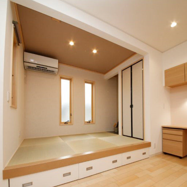 ト小上がりの畳コーナー 畳は縁の無い琉球調畳を採用。小上がりの畳下には、引き出しの収納を設置いたしました。