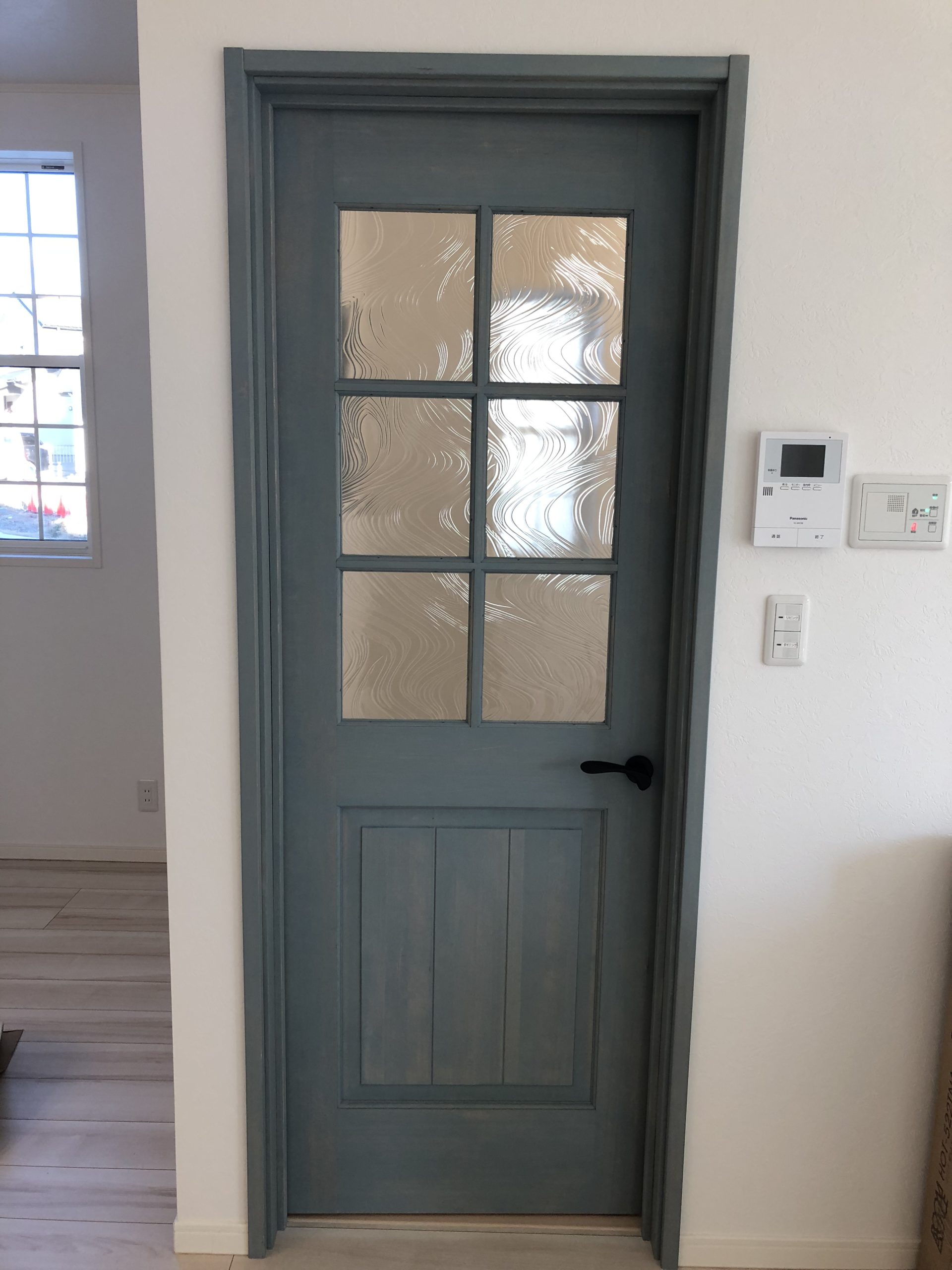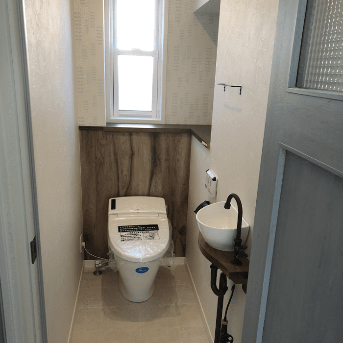 トイレの内装や手洗いも風合いの良いアンティーク調のデザインです。扉もクレバリーホーム標準品ではなく、お客様のご要望の扉を施工してあります。