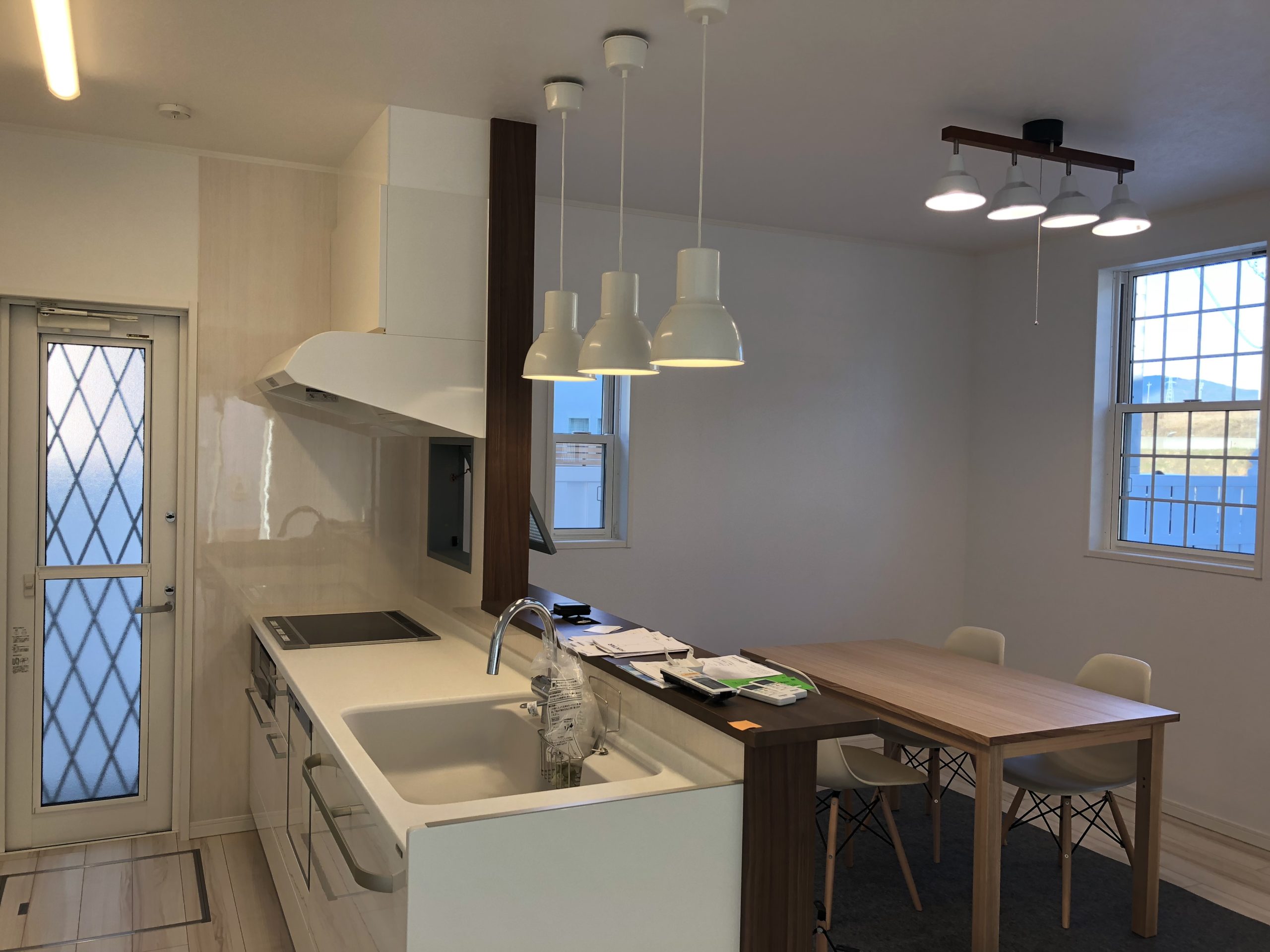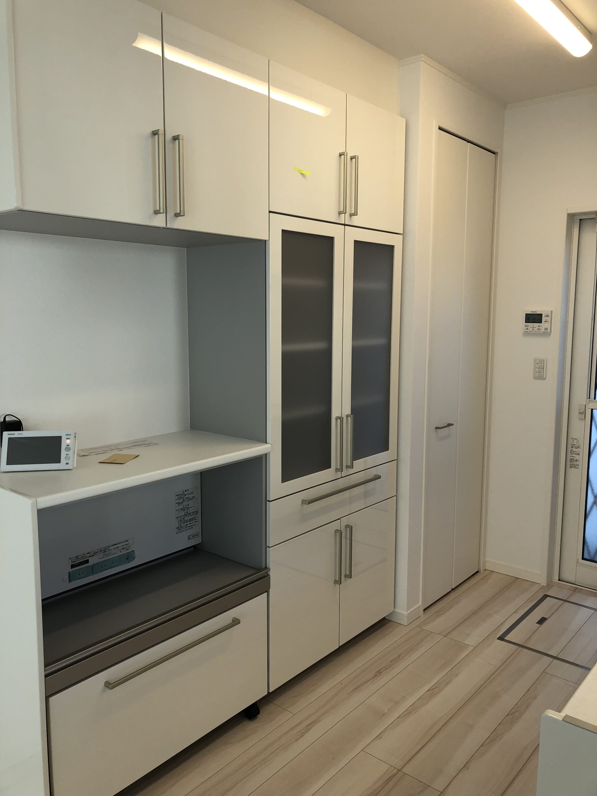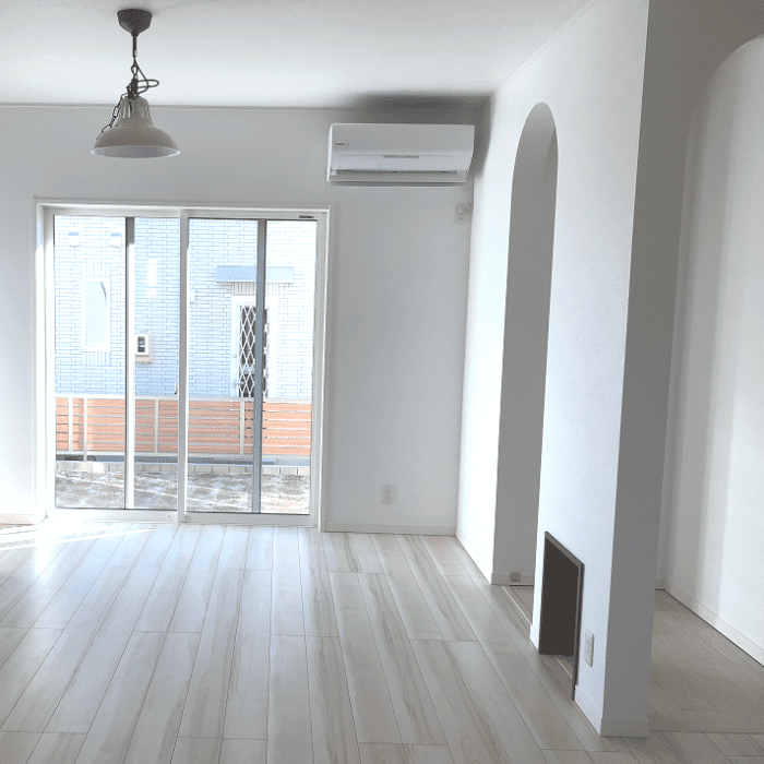リビングはすっきりとした白を基調とした内装デザインです。室内犬を飼っているので、犬の入り口があり、その奥は犬のトイレスペースになっています。