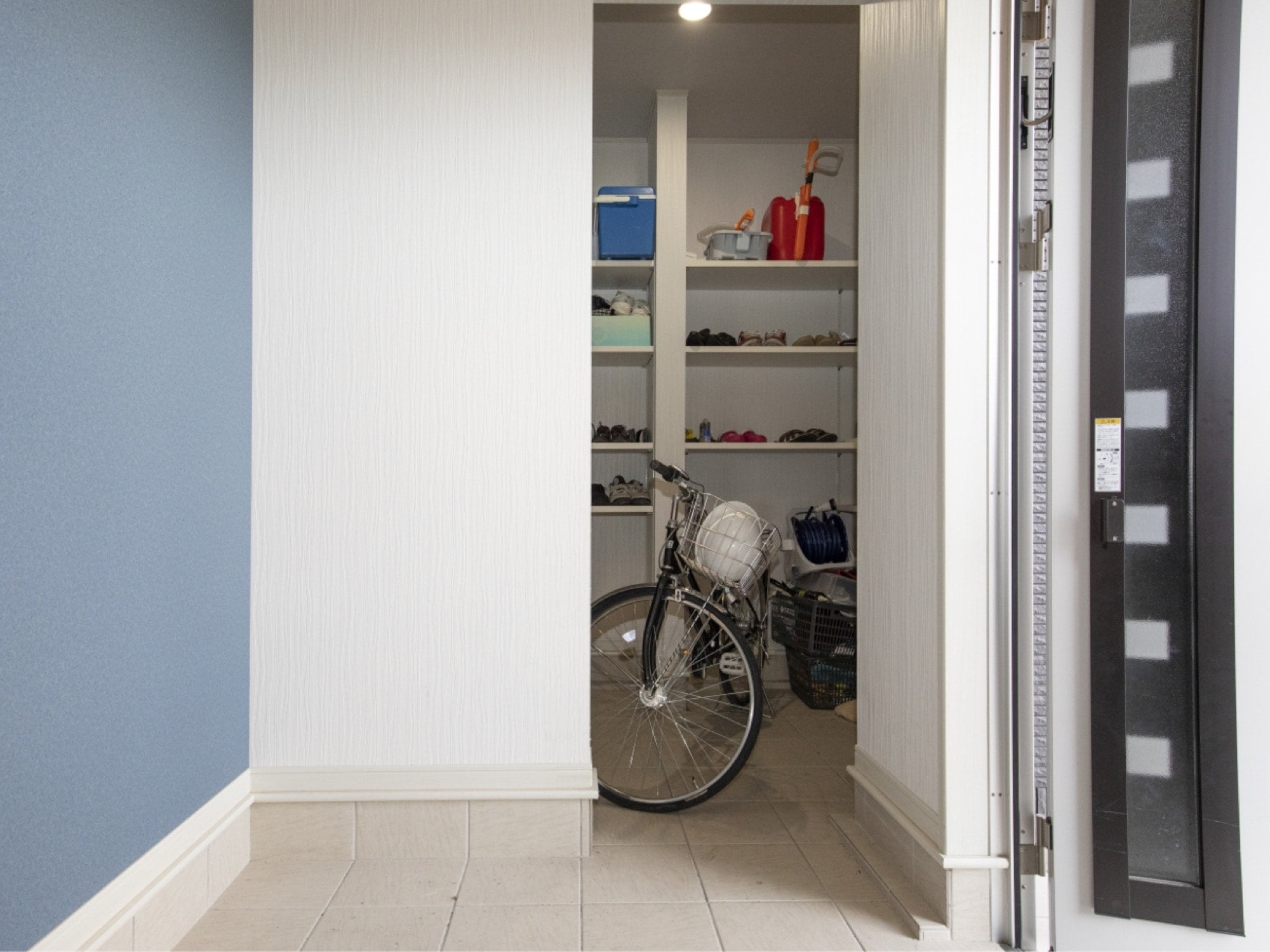 例えば、あるお客様邸の玄関収納は、玄関を開けて右手側に大きな土間収納が。