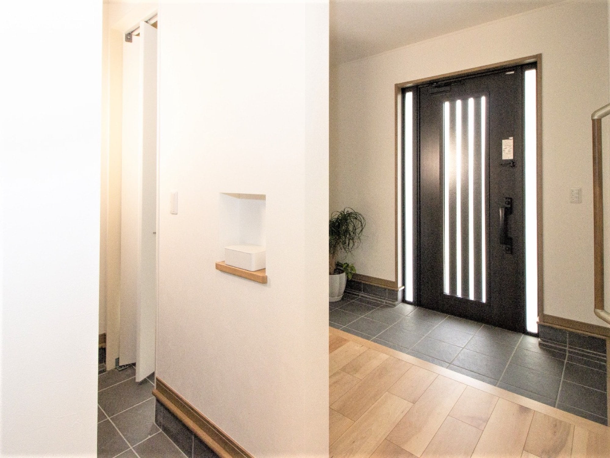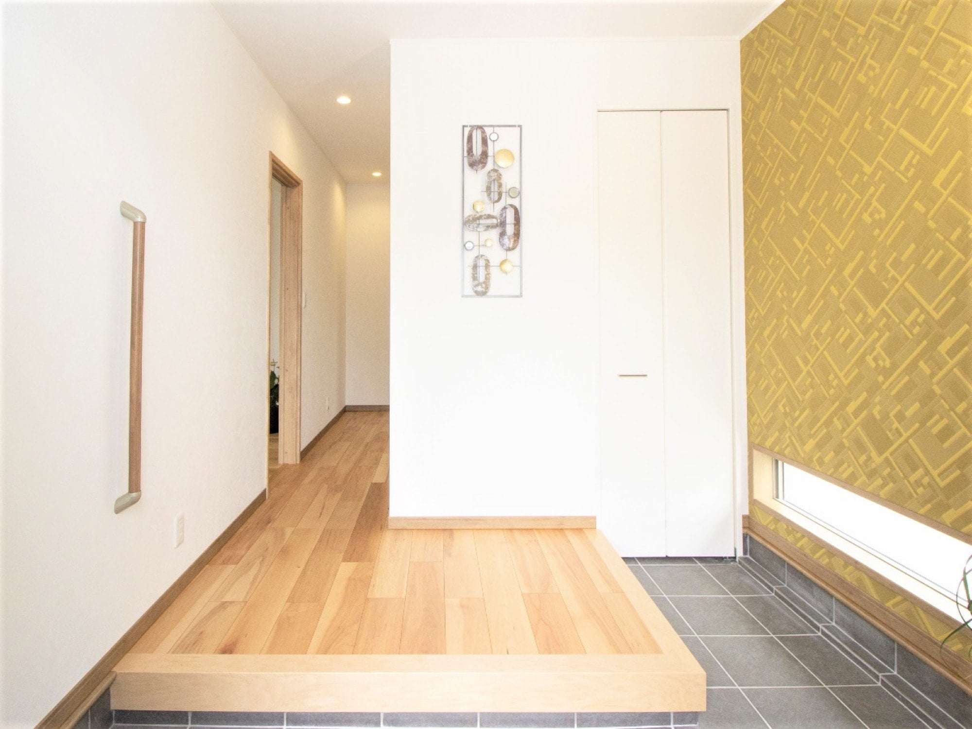 明るいイエローのクロスがおしゃれなこちらのお家は、玄関の土間空間をL字型に。広さを感じられる玄関になっています。一見シンプルな玄関のように見えますが、土間空間から白いドアを開けると……。