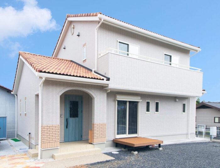 サーモンオレンジの瓦の屋根を組み合わせたこちらのお客様邸は、白をベースに玄関ドアのブルーに屋根のオレンジをアクセントカラーにしています。