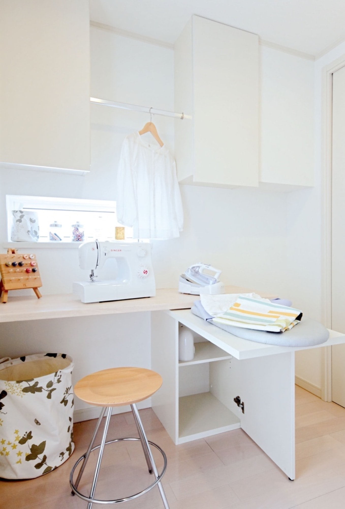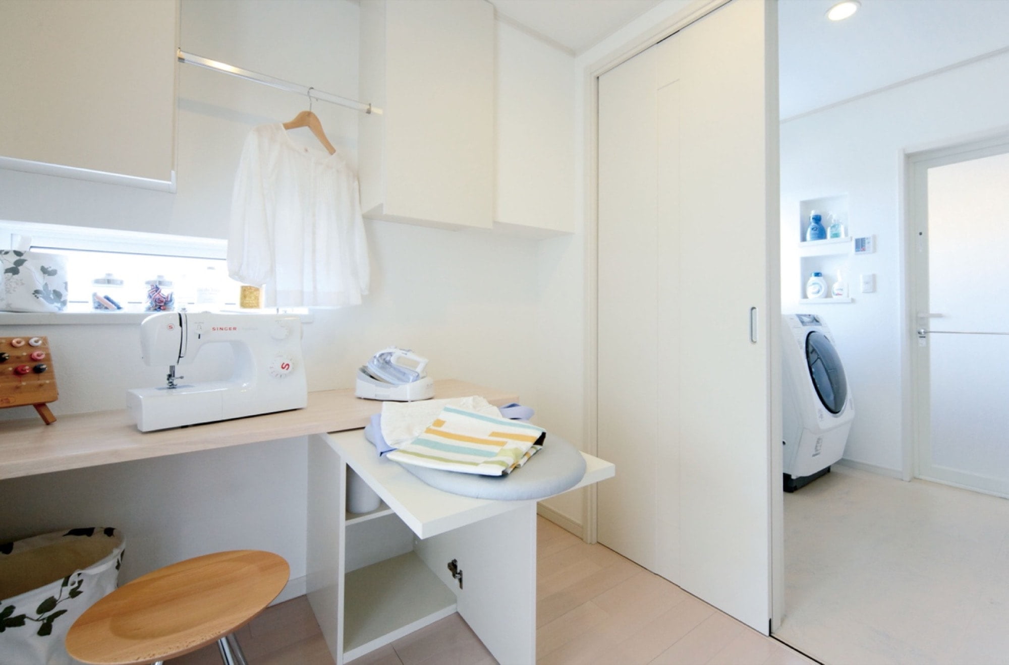 同じ空間にちょっと洗濯ものを畳んだり、アイロンをかけたりできる作業台やカウンターをつけておくと便利!