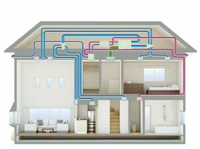 全館空調とは、屋根裏に設置する1台の空調機からダクトを通じて、夏は冷気を、冬は暖気を、家中に送る空調システムです。