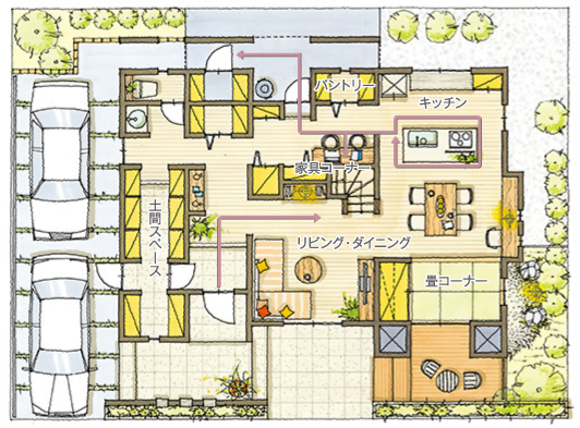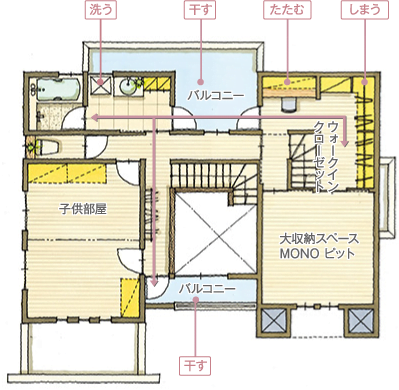 例えば洗濯物が集まるバスルームやサニタリーを2階に配置することで、洗う、干す、たたむ、しまうといった動線が流れるような一連の動作に。ムダな時間を省き、奥さまの日常にもゆとりが生まれます。