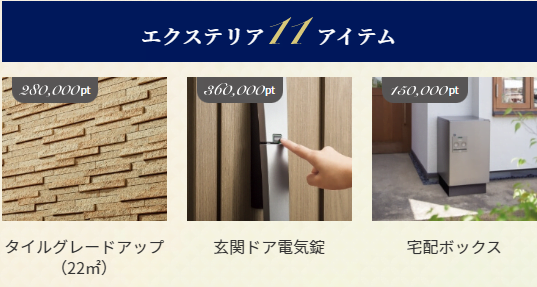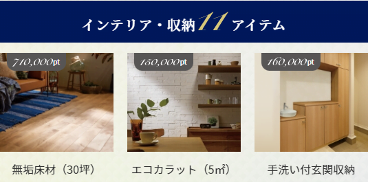 「エクステリア」「インテリア・収納」「設備」「その他」のカテゴリーから合計100万pt分、暮らし方に合わせてお好きなアイテムをお選びください!!