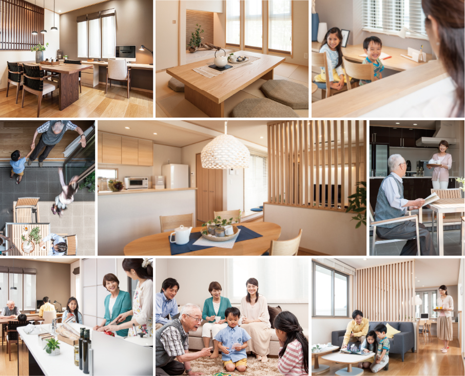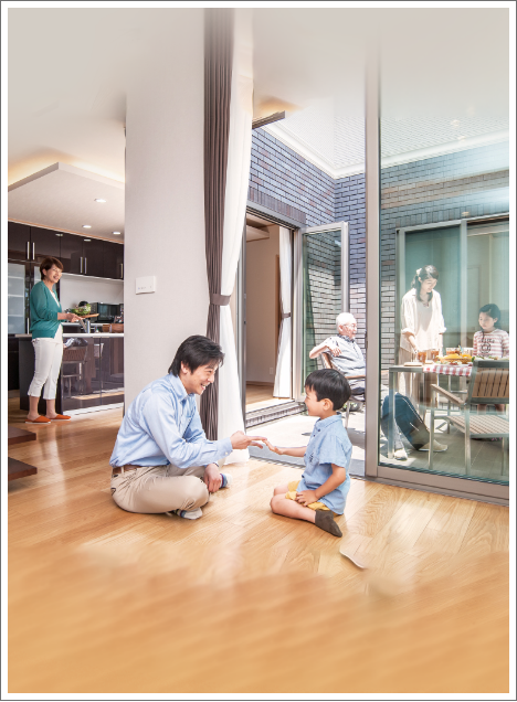 親世帯ゾーンとなる1階のリビング、ダイニング・キッチン、和室に囲まれたスペースに「つながり空間」としてコートヤードをご提案。普段は開放感あふれるオープンスペースとして日常生活を楽しみながら、2階に暮らす子世帯との自然なつながりを創出します。